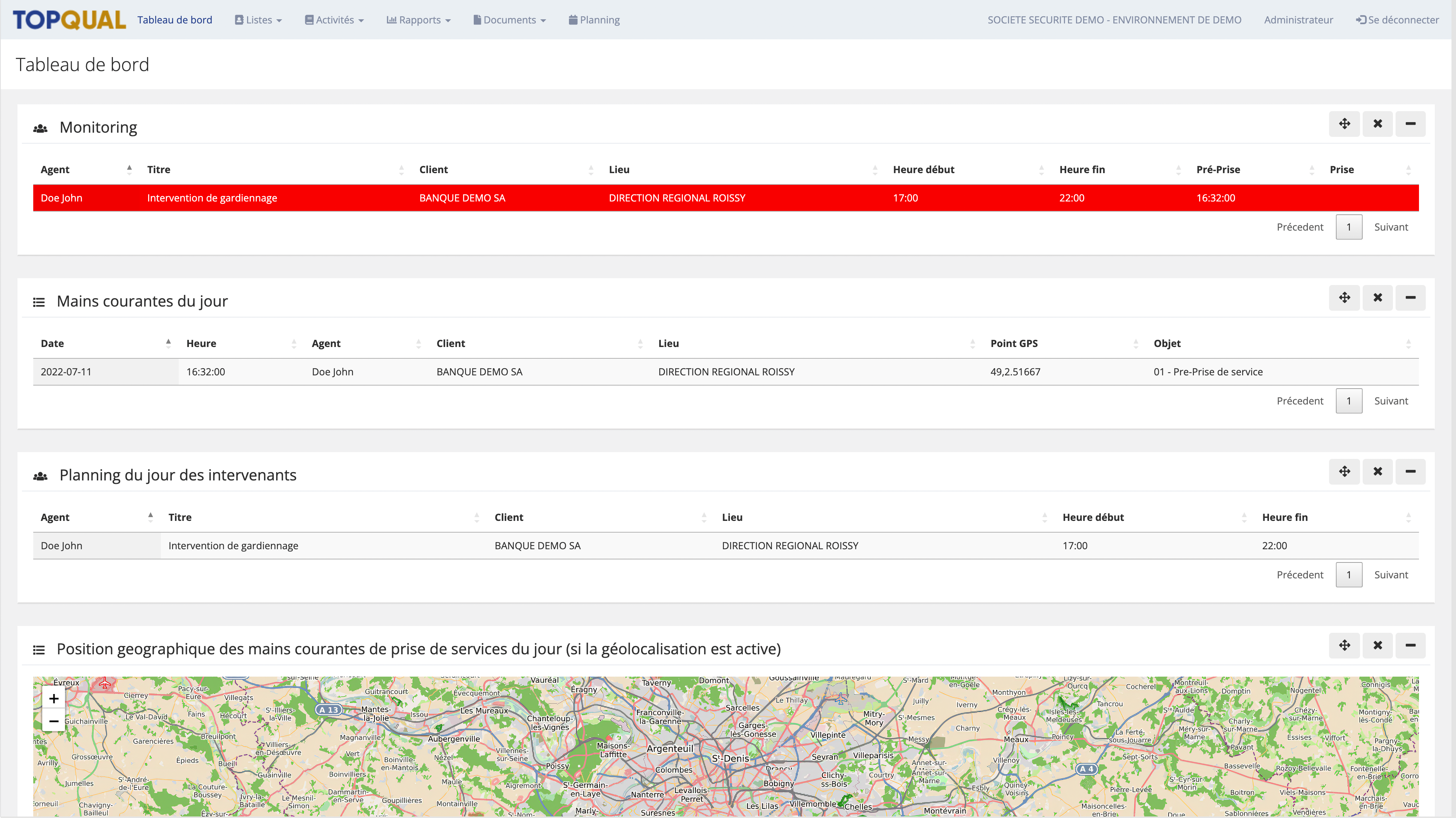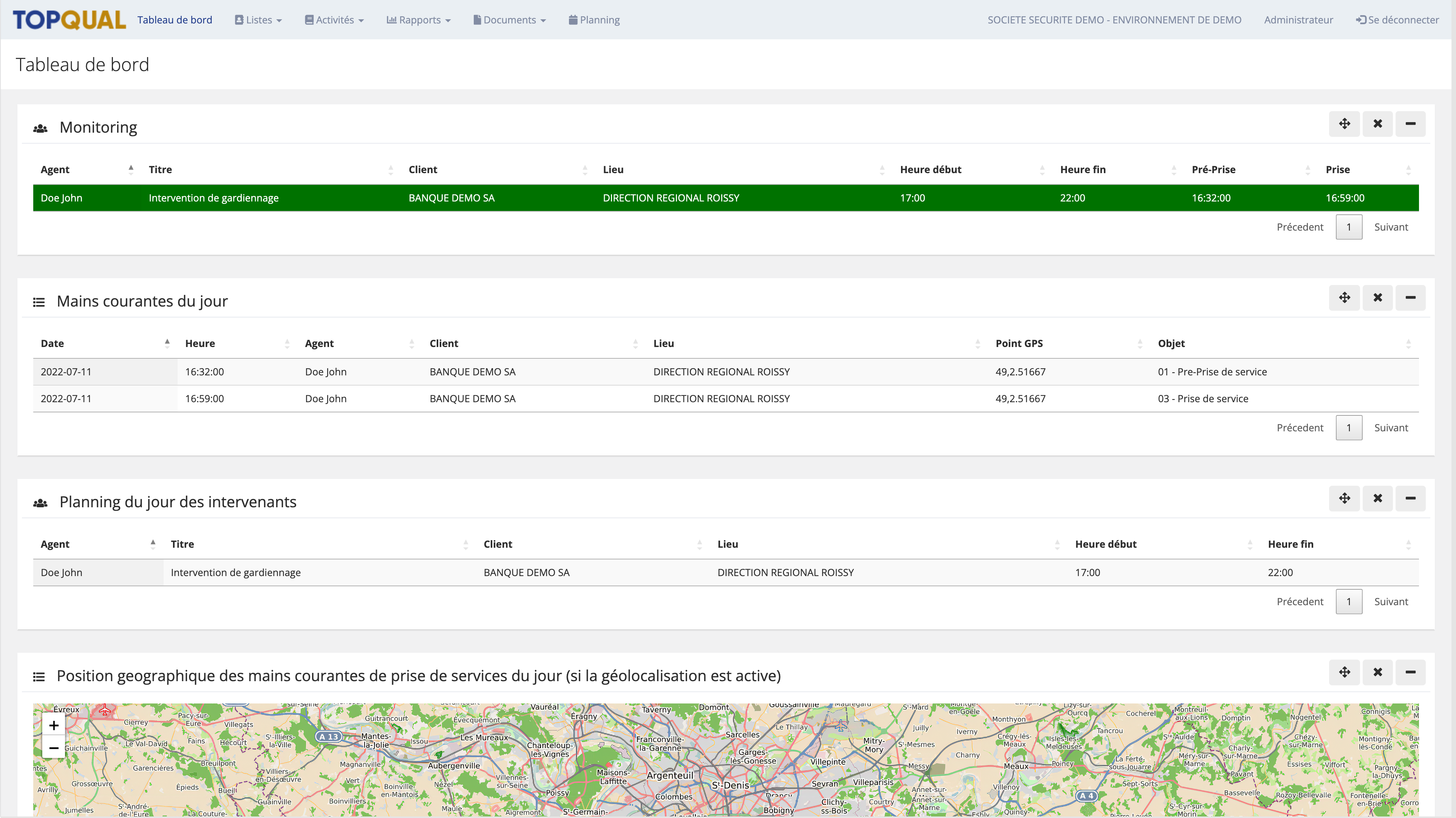 Sur la première page du portail, en un coup d'oeil, vous verrez le planning, les mains courantes, le monitoring des pré-prises et prises de services du jour pour vos collaborateurs